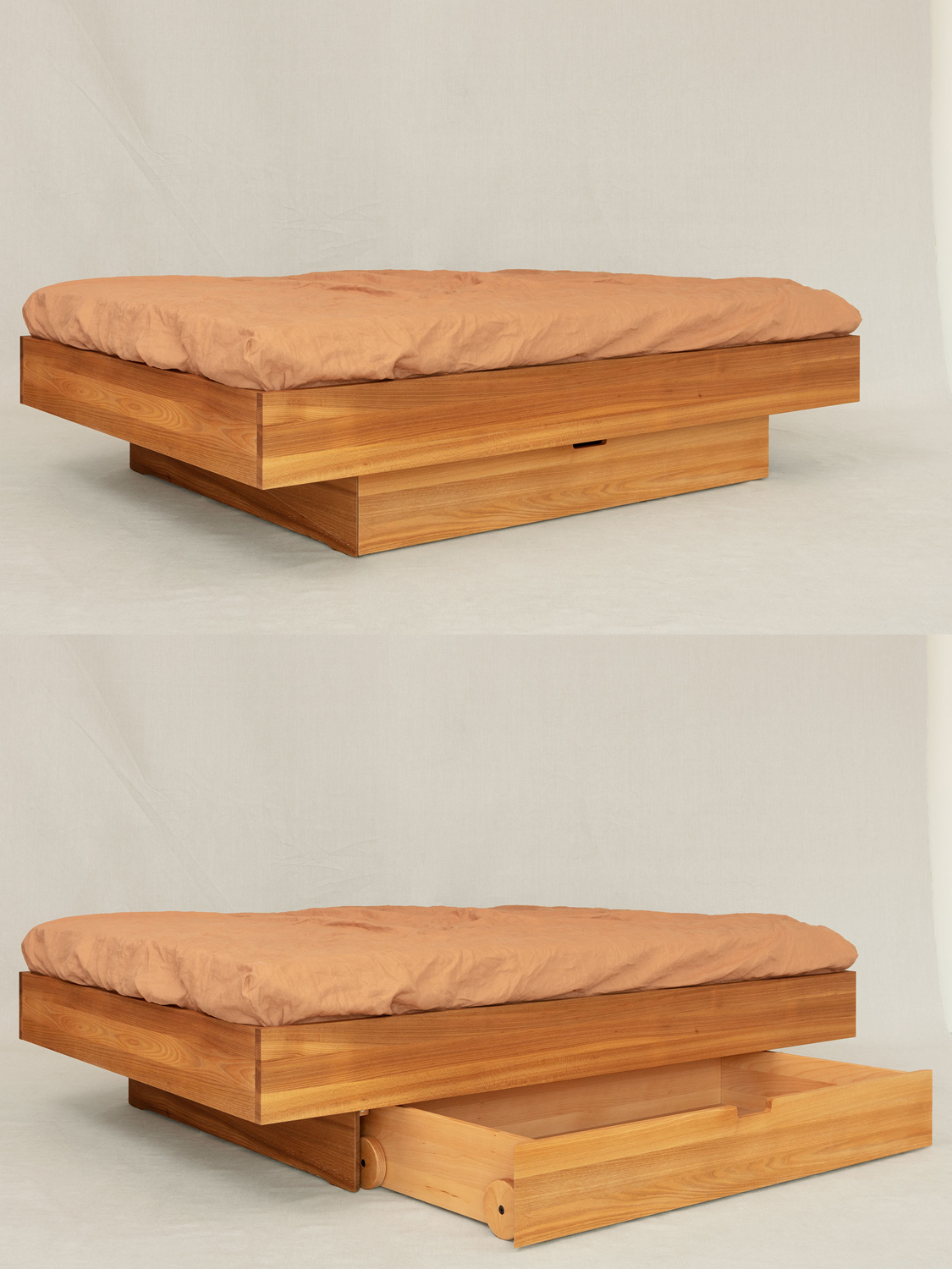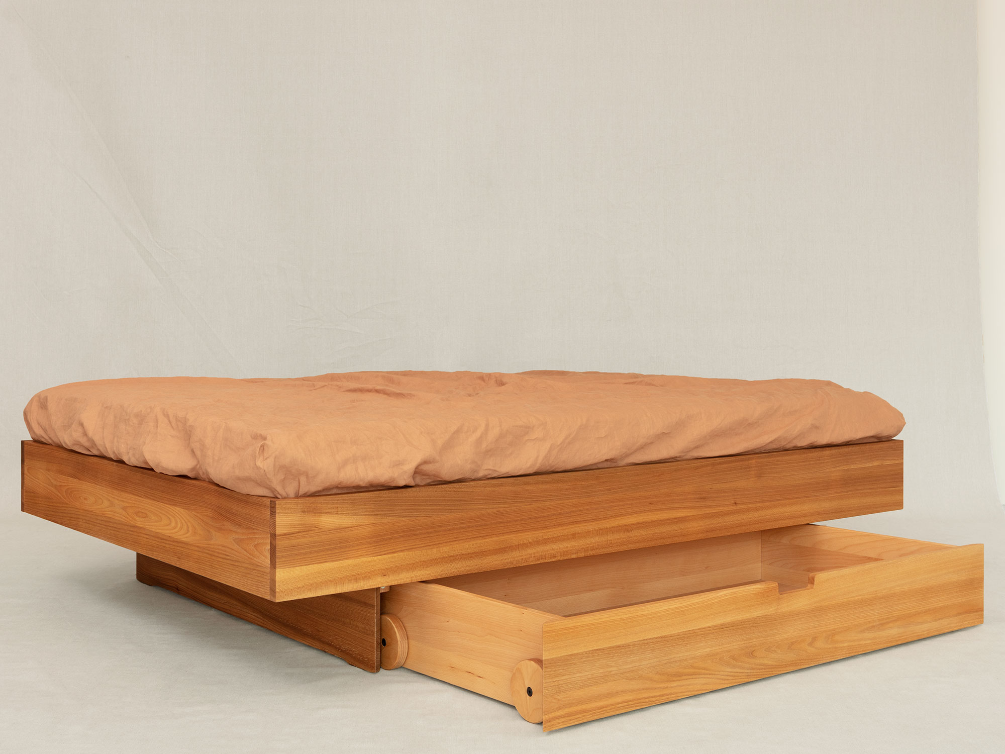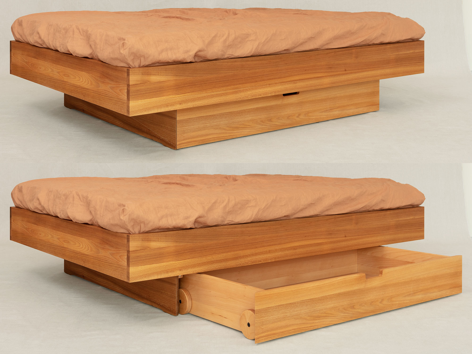 Avena ist ein absolut reduziertes Massivholzbett mit verschiedenen Unterbauoptionen und schwebender Optik. Wahlweise mit einem erhöhten Kopfteil erhältlich.