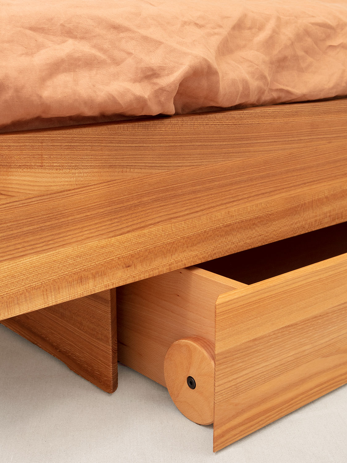 Beim zurückversetzten Unterbau vom zurückhaltenden Massivholzbett «Avena» kann man zwischen den schlichten Füssen, der eleganten Kufe oder einer praktischen Lösung mit integrierter Bettschublade wählen.