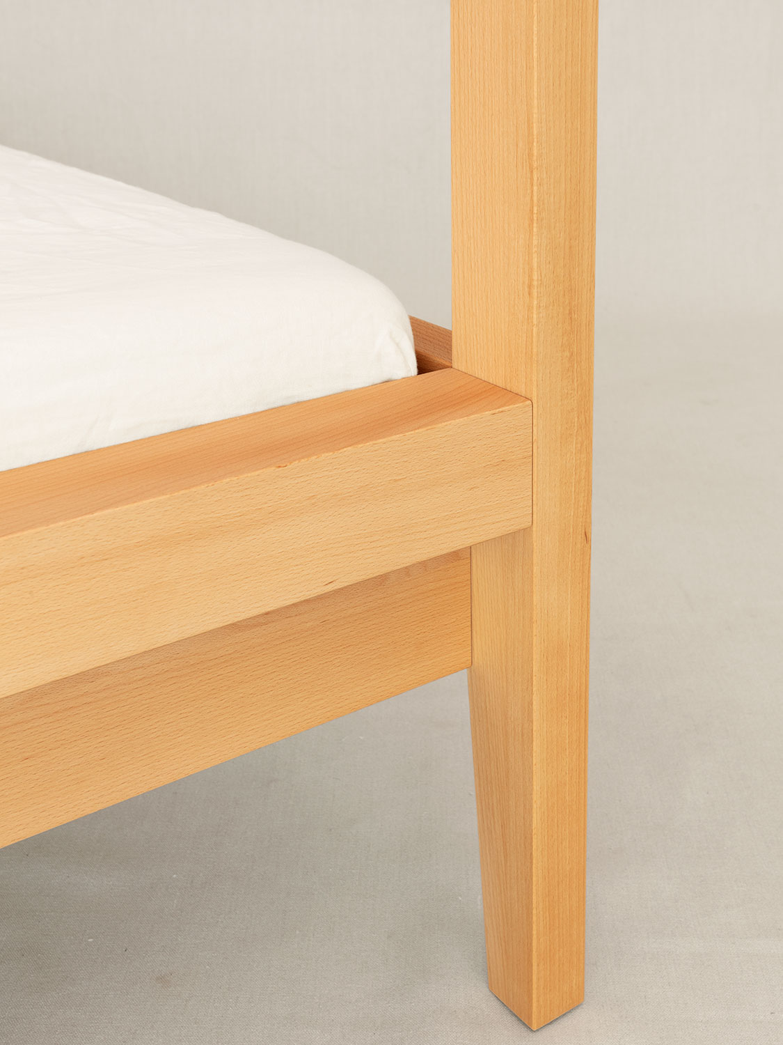 Das umgebende Massivholzgebälk zeichnet optisch die Grenzen des Schlafplatzes und kann gleichzeitig als Gerüst für die verschiedensten – dekorativen wie zweckmässigen – Elemente dienen: Zum Beispiel einen Verdunkelungsbaldachin, einen Moskitobaldachin, oder eine Lichterkette.