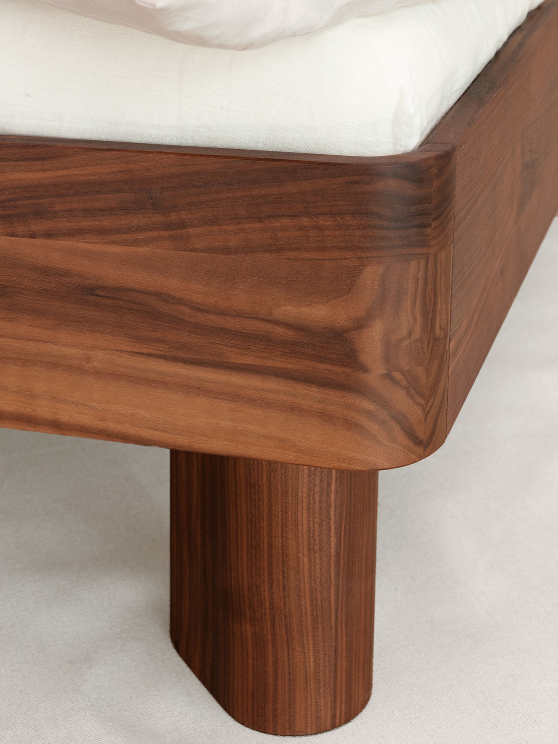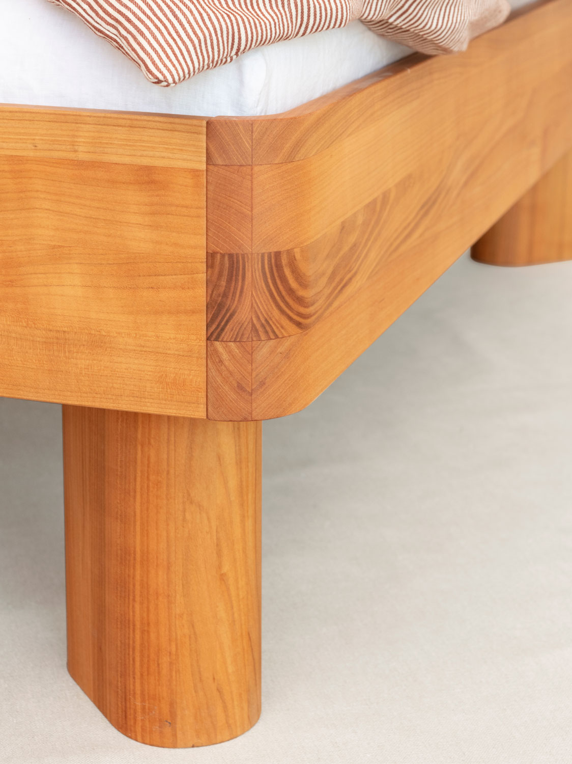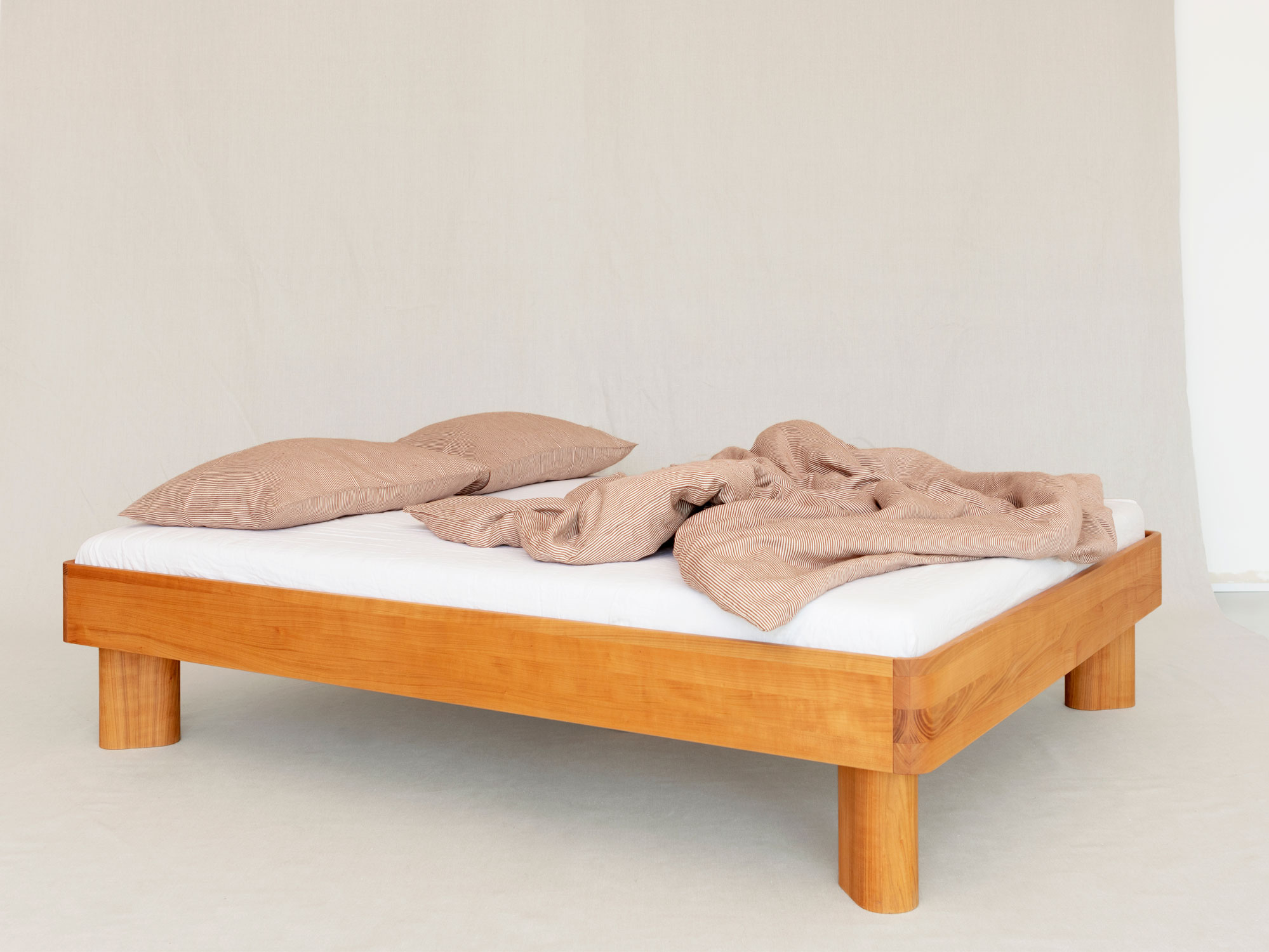 MassivholzbettEin schlanker Rahmen mit gerundeten Ecken und Kanten stösst beim Bett Re-Sferico auf einen verhältnismässig dicken Massivholzfuss.