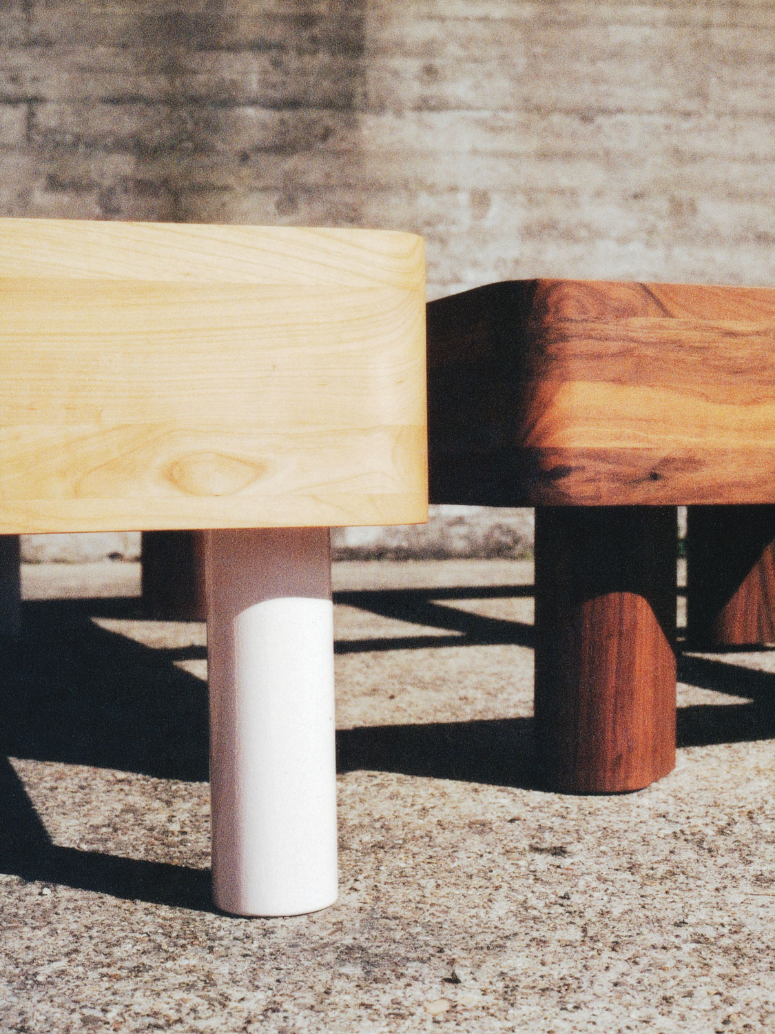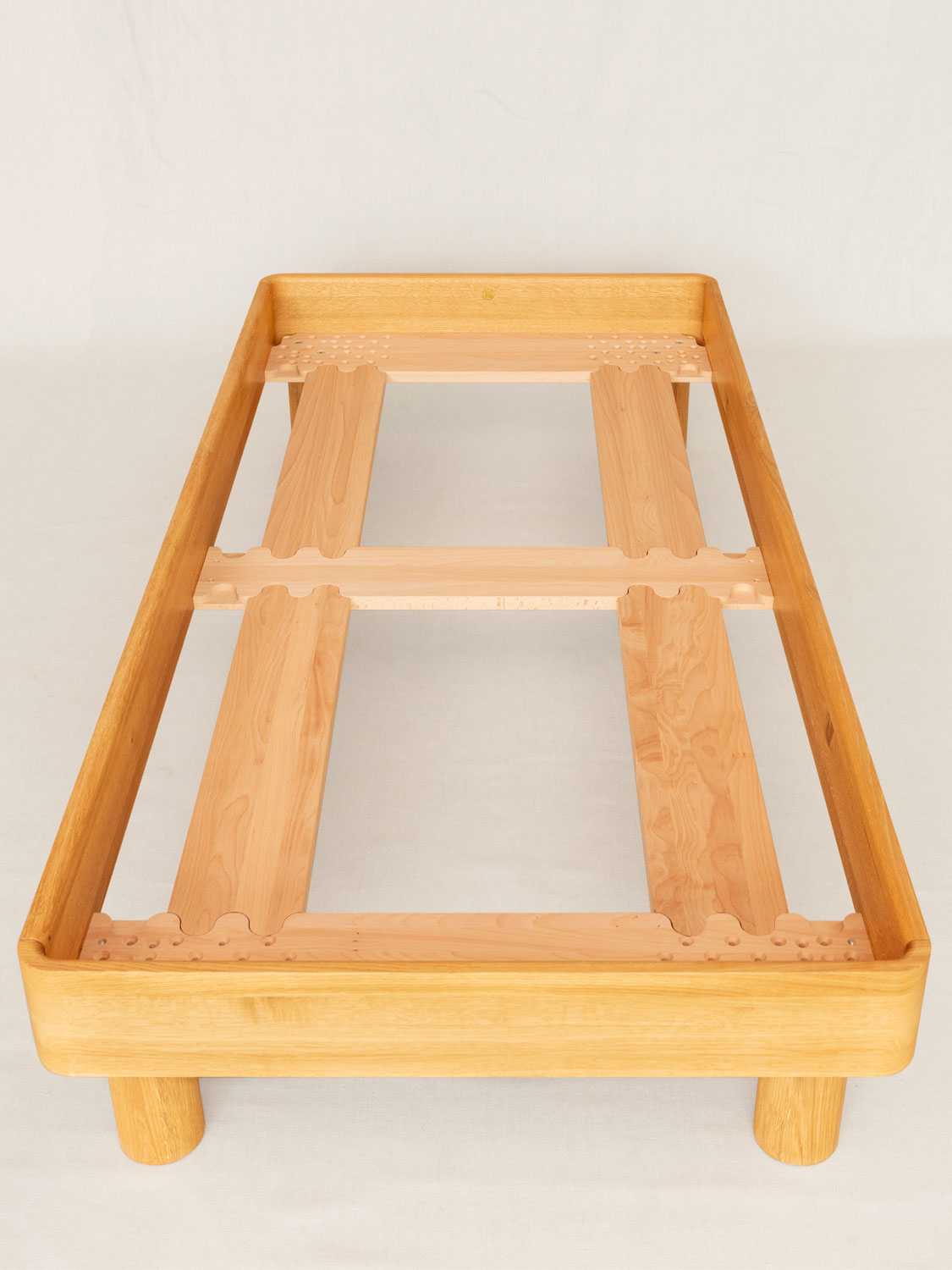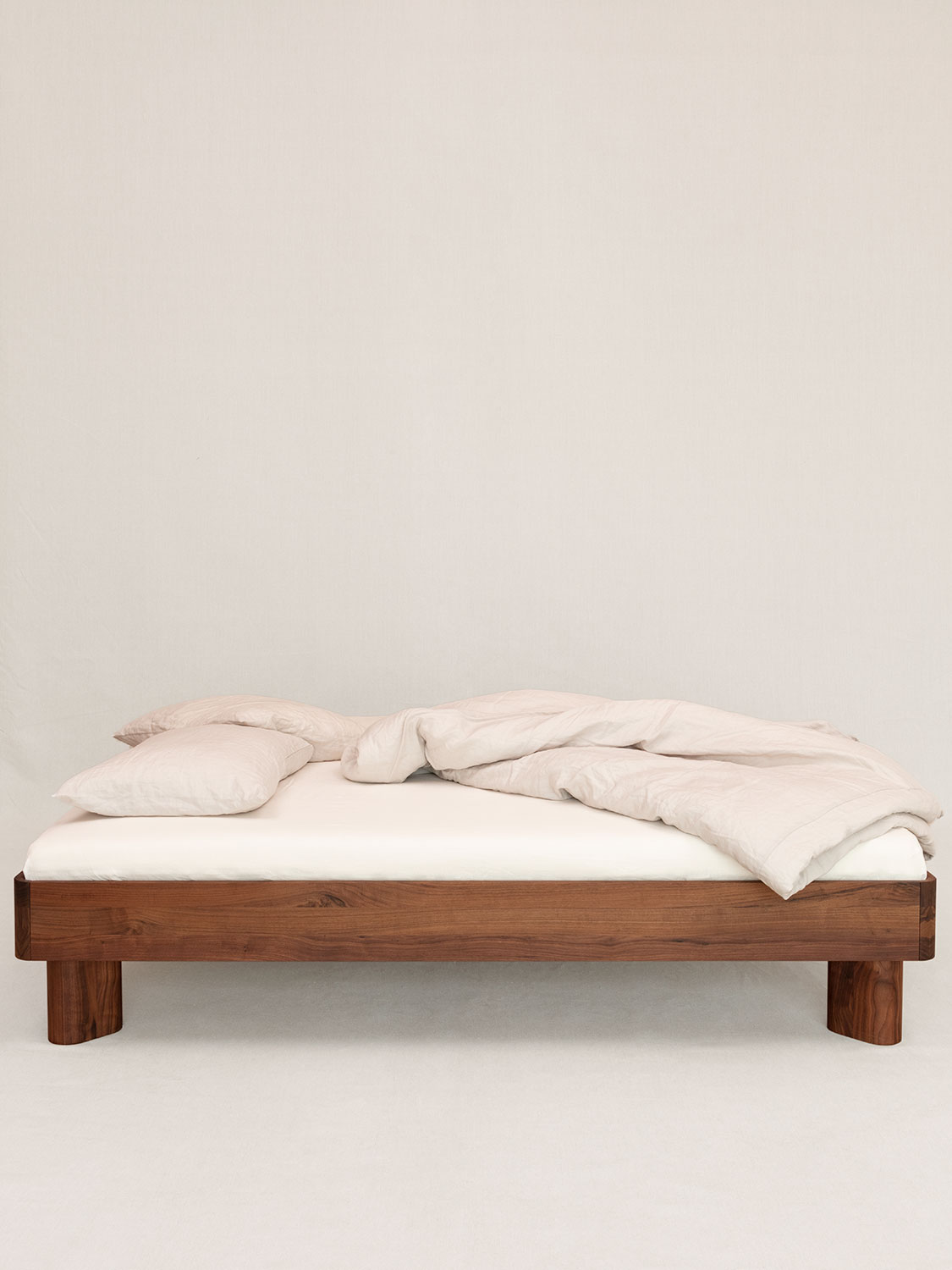 MassivholzbettEin schlanker Rahmen mit gerundeten Ecken und Kanten stösst beim Bett Re-Sferico auf einen verhältnismässig dicken Massivholzfuss.