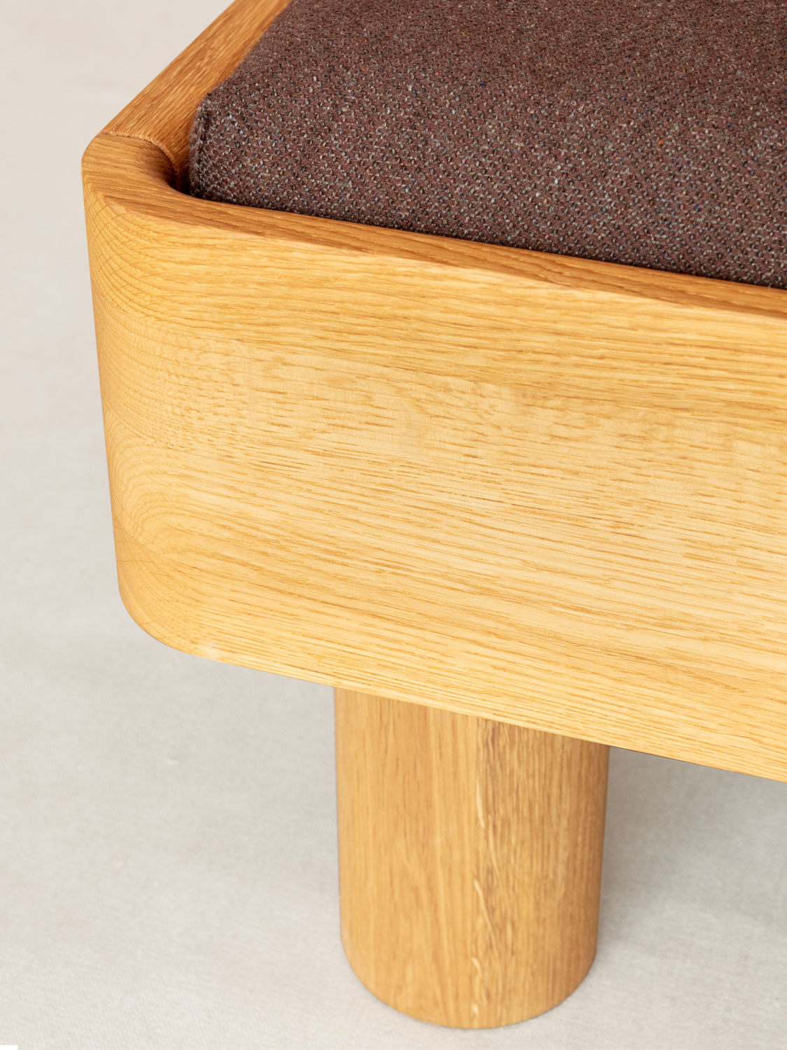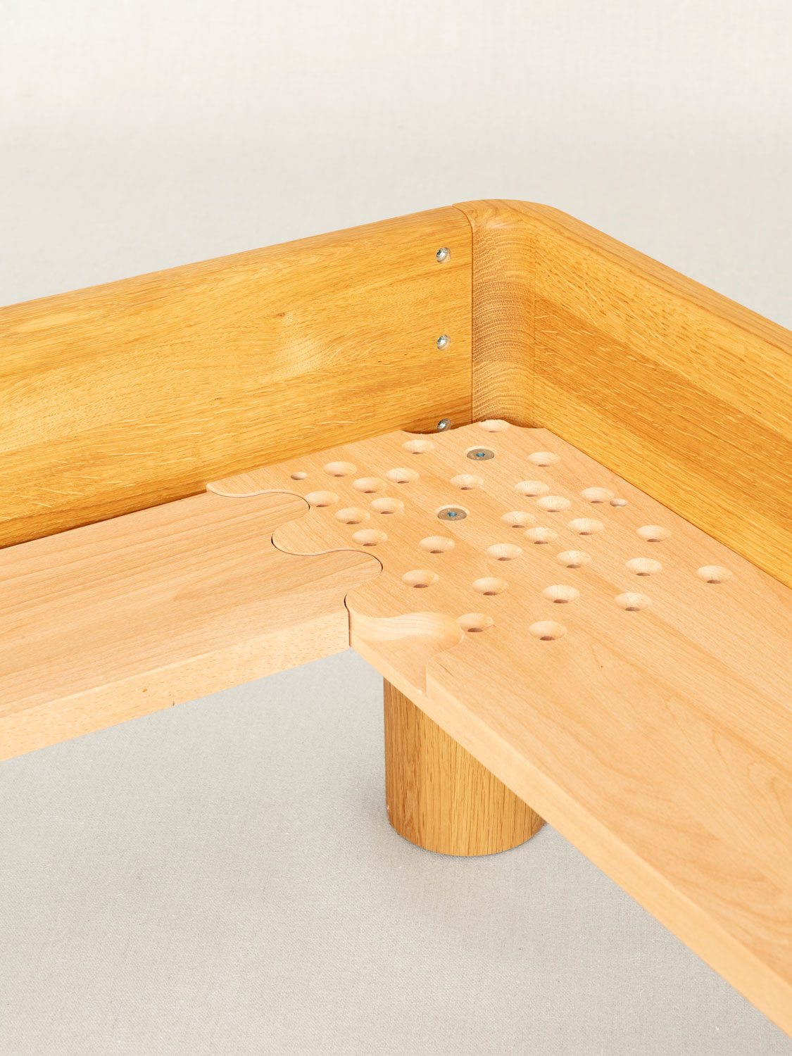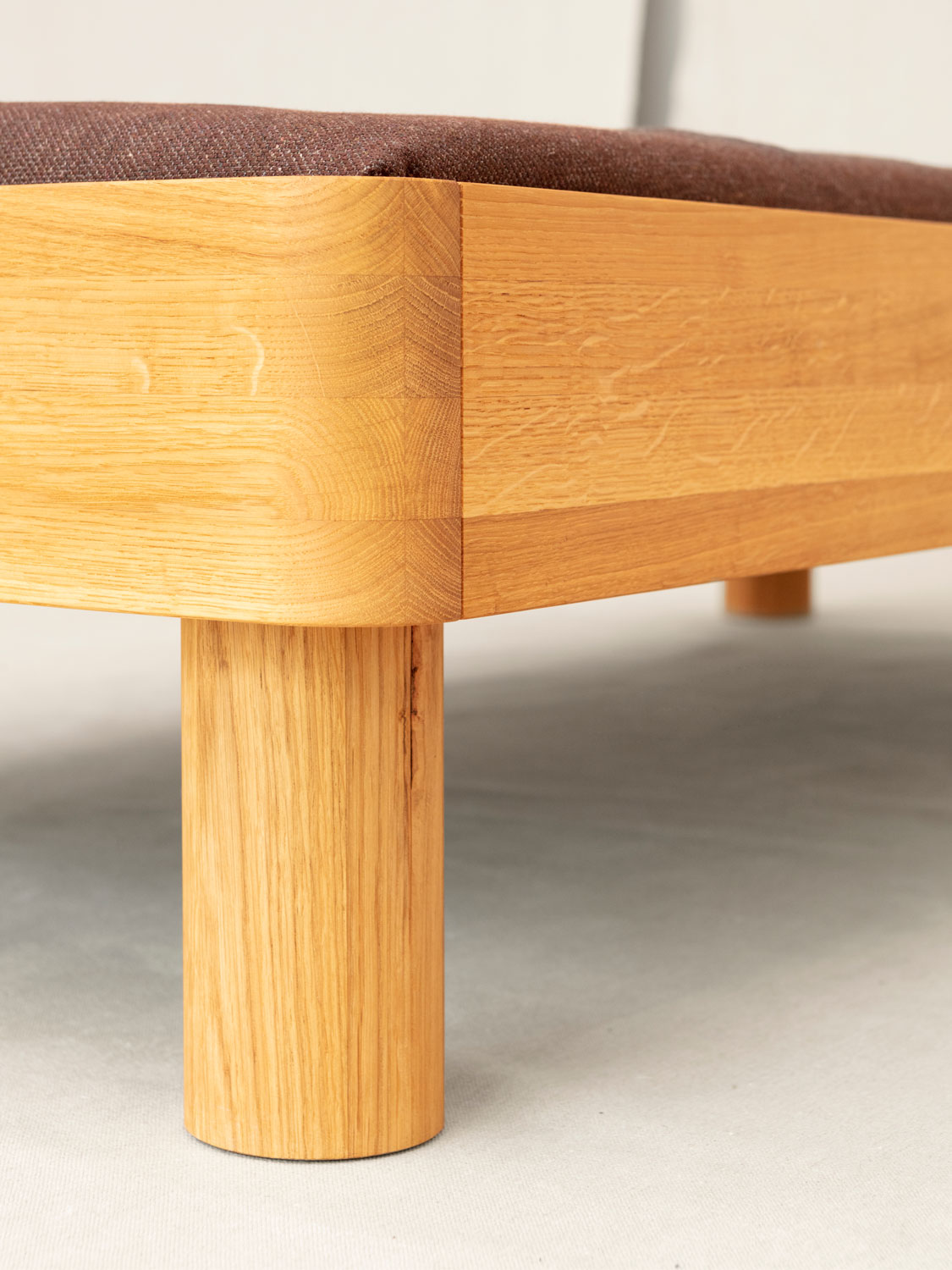 Der schlanke Rahmen stösst wiederum auf einen – je nach Konfiguration – eher festen Fuss, was eine optische Spannung entstehen lässt. Zudem kann die Wirkung des Bettes noch gezielt beeinflusst werden, indem der Fuss im vorhandenen Raster Umplatziert wird. Die Füsse haben wahlweise einen Durchmesser von 80 oder 100 mm oder die besonders prägnante «Pillenform». Auch das Innenleben des Bettes kann mit wenigen Handgriffen für einen klassischen Einlegerahmen oder speziell fürs Hüsler-Nest umfunktioniert werden.