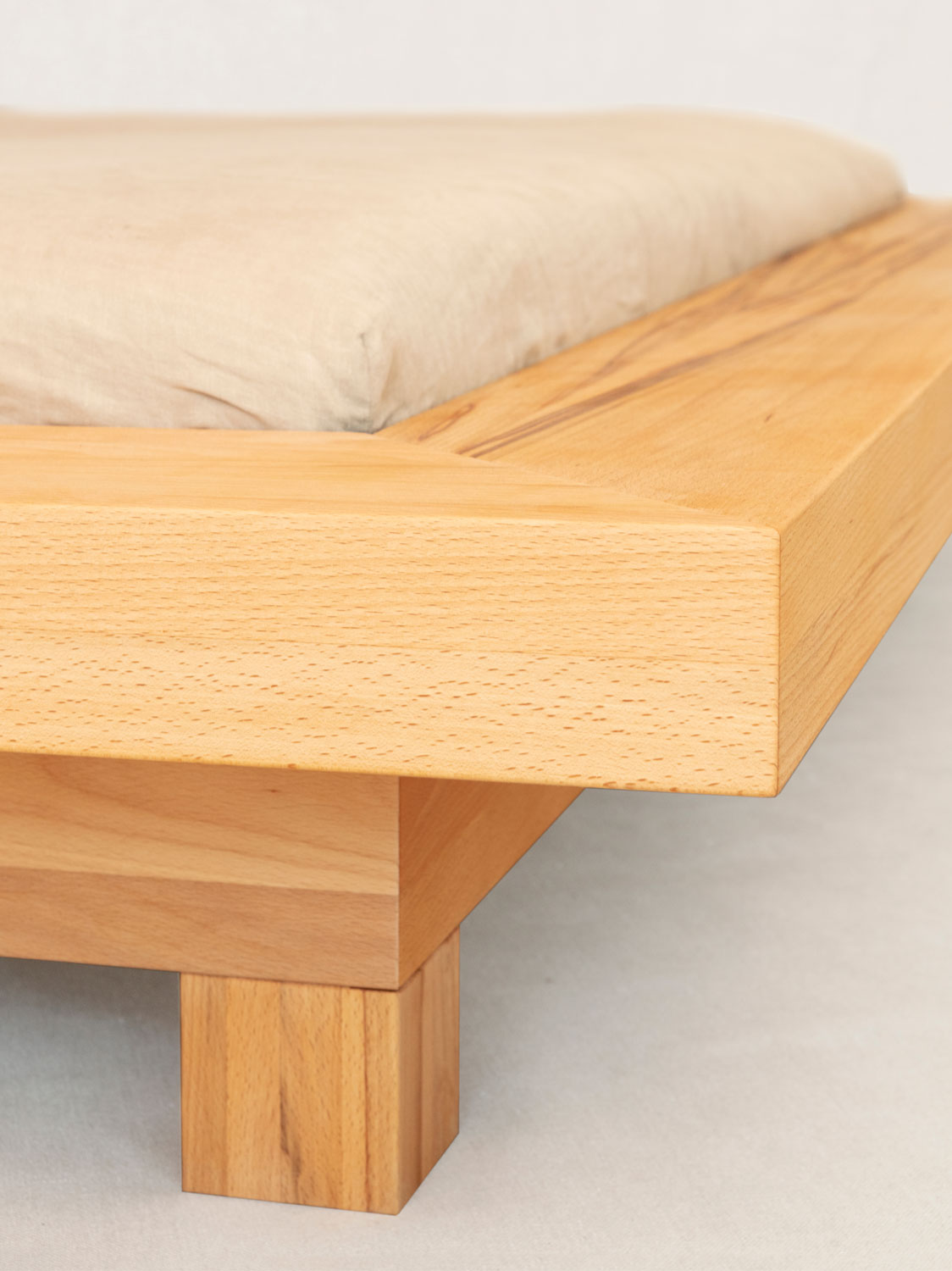 Man könnte fast sagen, das sehr reduzierte Design gleicht den grosszügigen Materialeinsatz aus: Vier massive Balken von 8 x 18 cm umgeben den geborgenen Schlaf im Massivholzbett Selago.