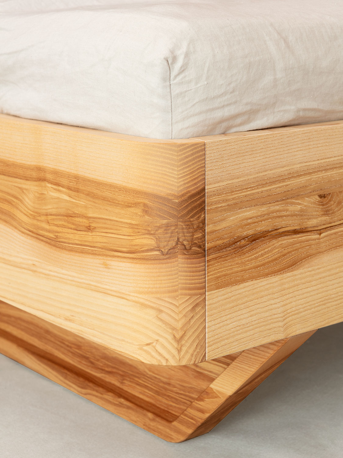Damit auch die Suchmaschine weiss, was gemeint ist, bezeichnen wir das Massivholzbett Sferico an dieser Stelle als «Schwebebett». Beim zurückversetzten Unterbau kann man zwischen den schlichten Füssen, der eleganten Kufe oder einer praktischen Lösung mit integrierter Bettschublade wählen.