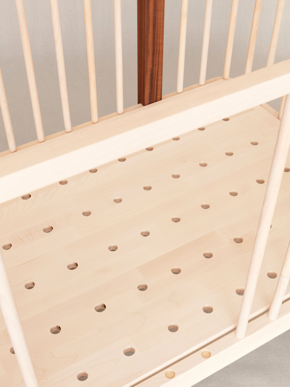 Babybett aus MassivholzEin langlebiges Babybett aus Massivholz das einen durch verschiedene frühkindliche Phasen begleitet.