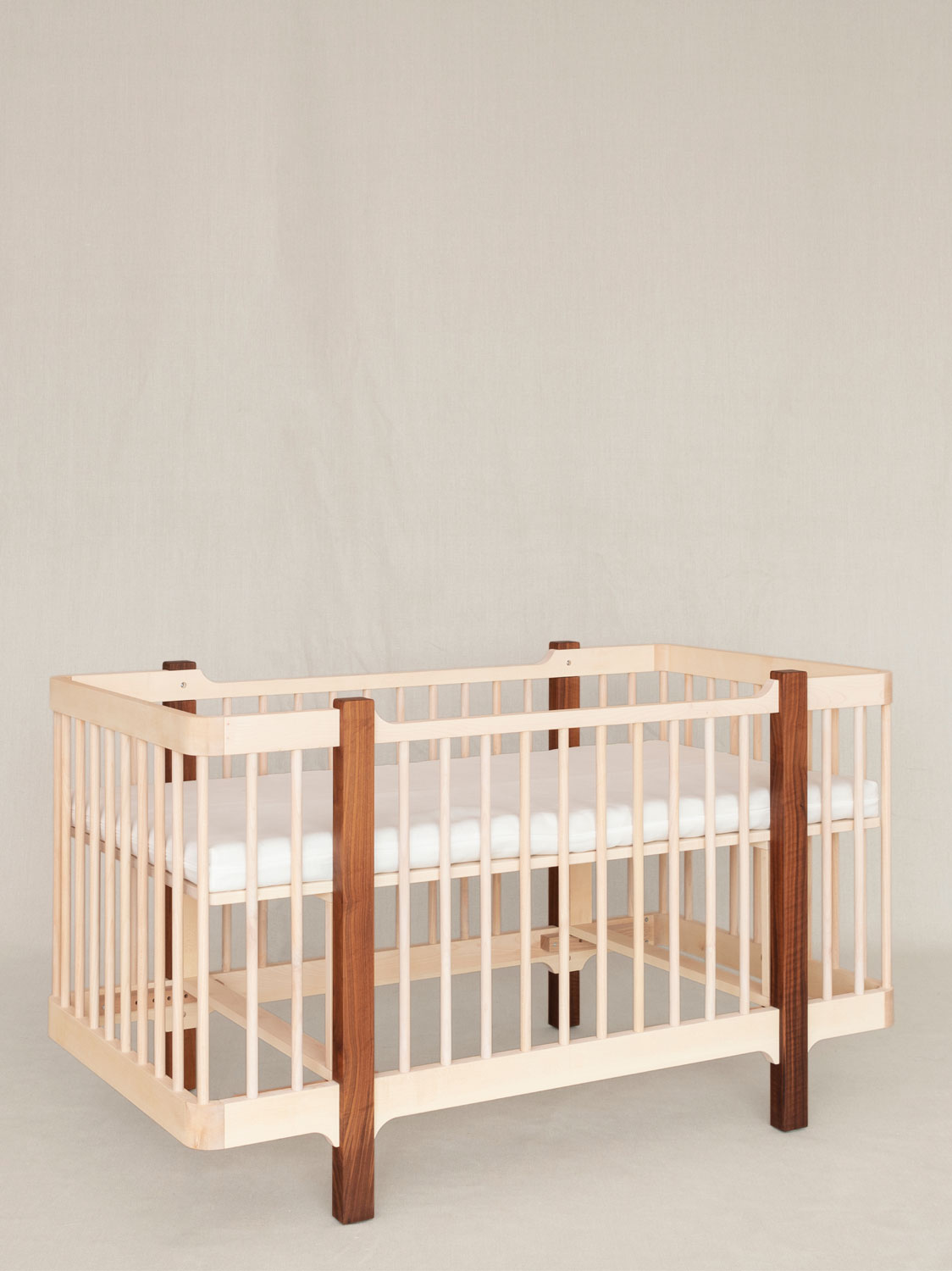 Zur Wandelbarkeit: Die Liegefläche kann auf zwei Höhen platziert werden, höher in der Neugeborenenphase, zuunterst sobald das Baby sich selber aufsetzen kann. Sobald man dem Kind etwas Mobilität ermöglichen will, können vier seitliche Stangen entfernt werden. Soll das Bett als Beistellbett genutzt werden, kann eine ganze Seite entfernt werden. In dieser seitlich offenen Form wird das Bett auch gerne noch, mit Kissen Bestückt, als Kindersofa verwendet. Sind die Kinder definitiv aus dem Bett «herausgewachsen» lässt sich das Möbel zum Weitergeben auch beliebig oft zerlegen und wiederaufbauen. Die Möglichkeiten werden wohl am besten in unserem Umbauvideo veranschaulicht.