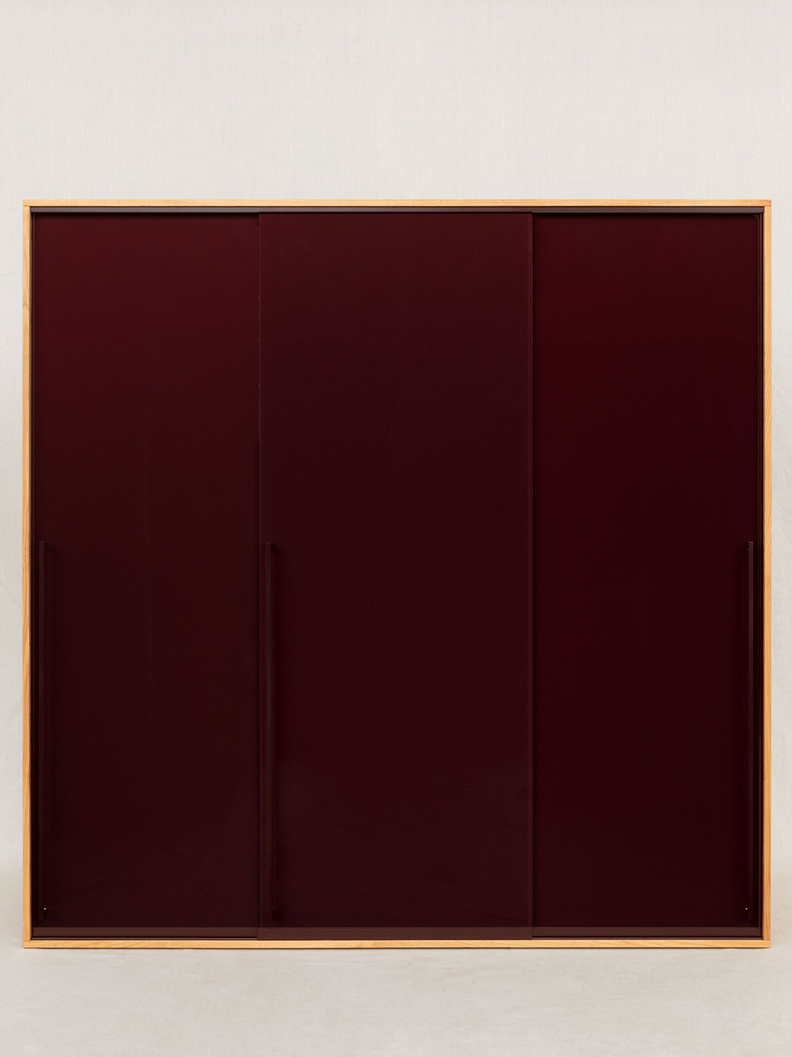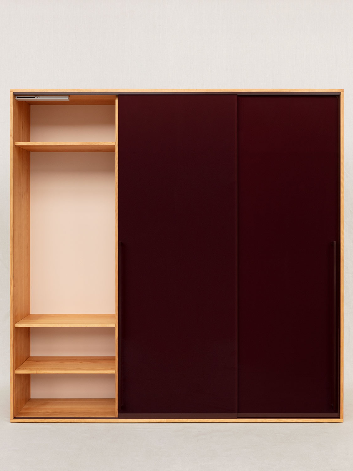 Massivholzschrank "Sfera" aus Nussbaum massiv mit Türen aus farbig lackiertem Glas -