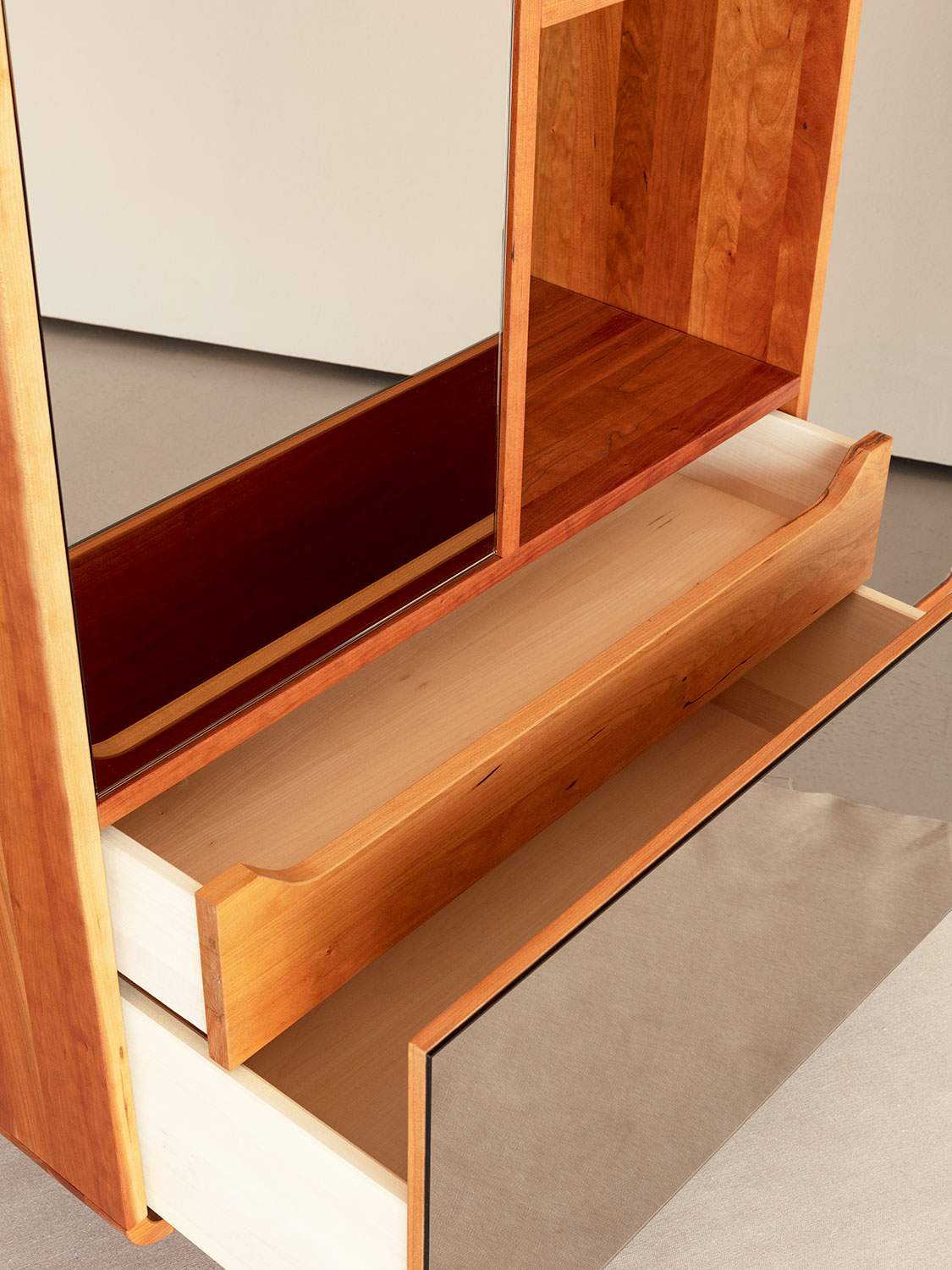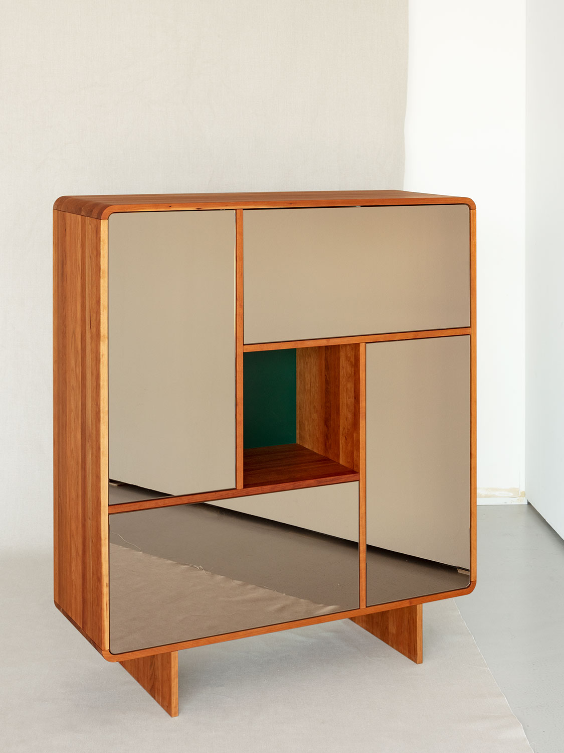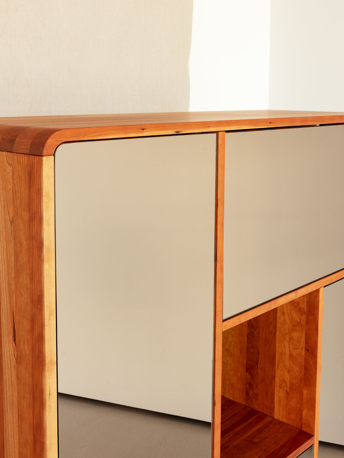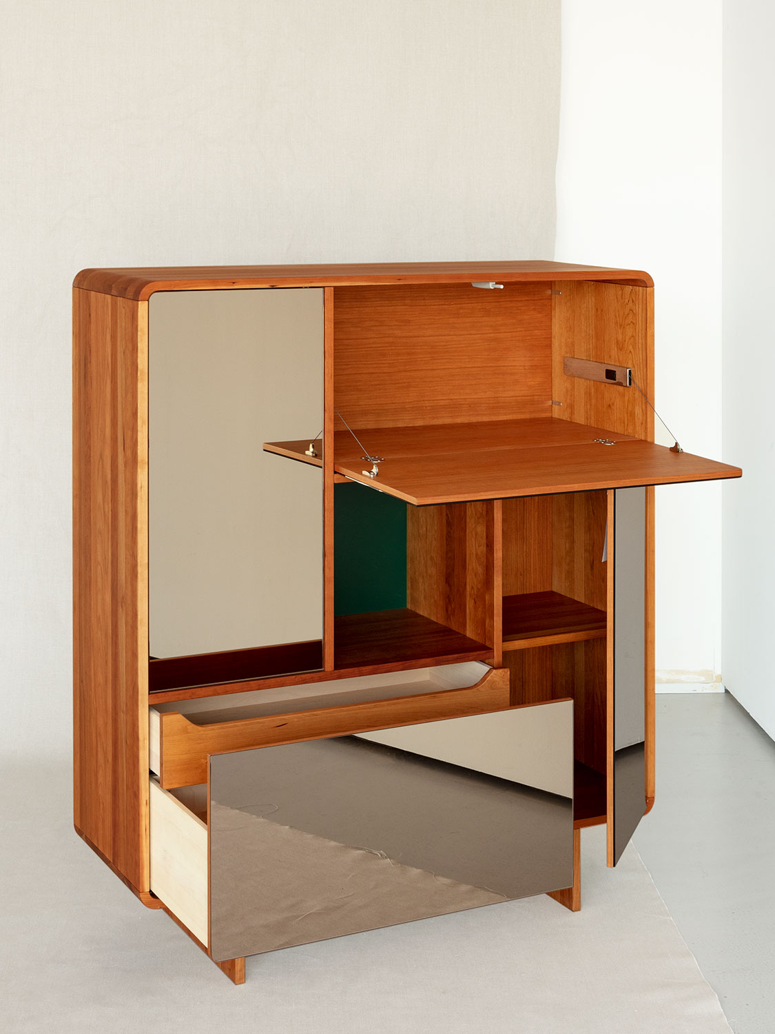 Massivholzkommode mit SpiegelfrontenDiese Massivholzkommode spielt mit einer Kombination aus Schublade, Klappe und Türen die sich um einen freien Raum in der Mitte drehen.