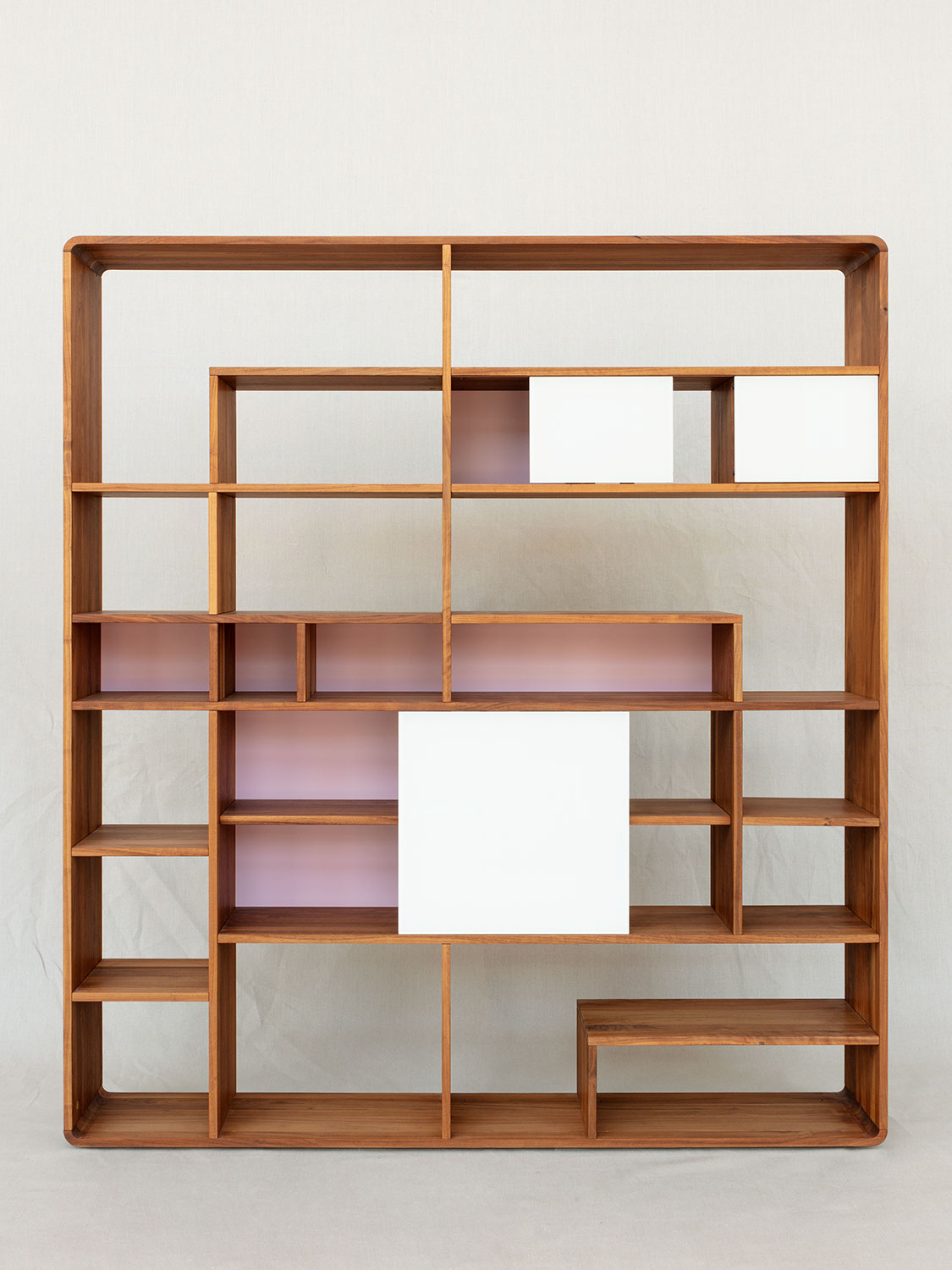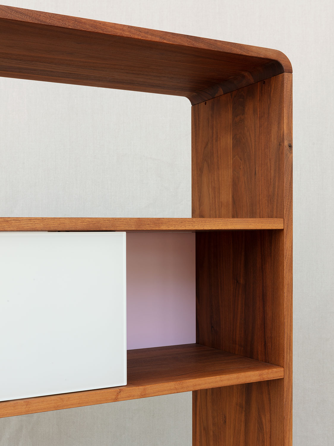 Mit seinen gerundeten Ecken und der verspielten Einteilung eignet sich das Möbel sowohl als Bücherregal als auch als schöne Fläche für dekorative Gegenstände. Online kann das Massivholzregal in vier Breiten und wahlweise mit oder ohne Schiebetüren konfiguriert werden.
