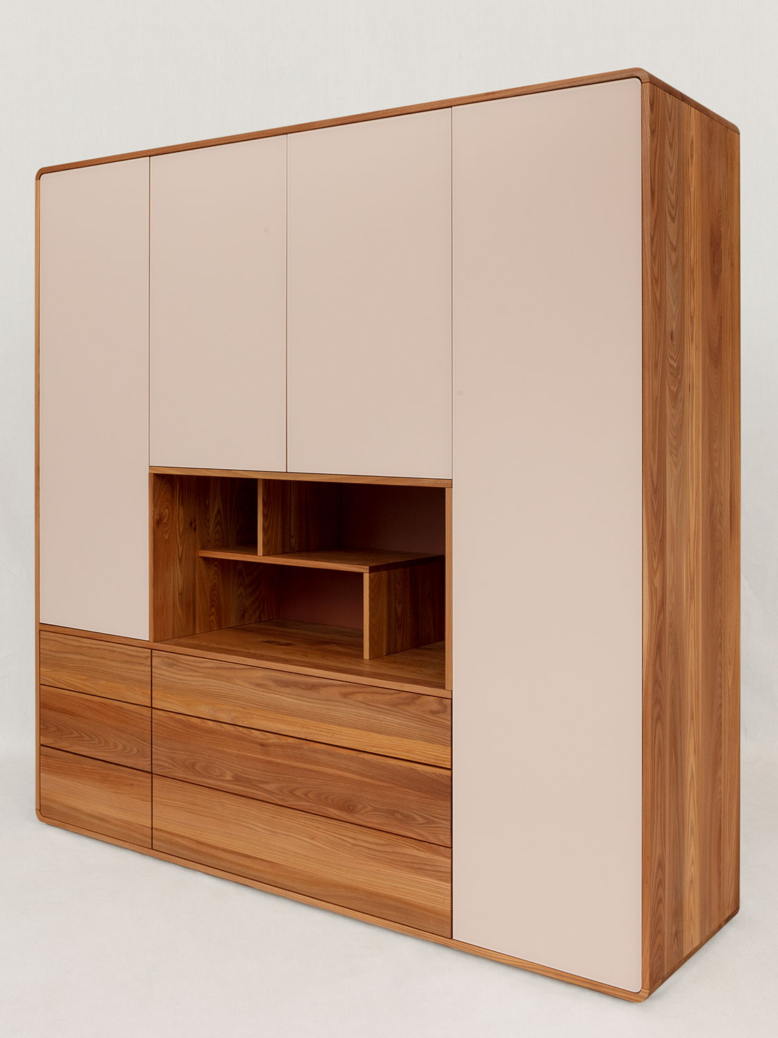 Der Massivholzschrank mit den runden Ecken hat gleich mehrere Hingucker: Die Kombination aus glänzendem glänzendem Glas mit dem lebendigen Holz und die offene Nische in der Mitte.