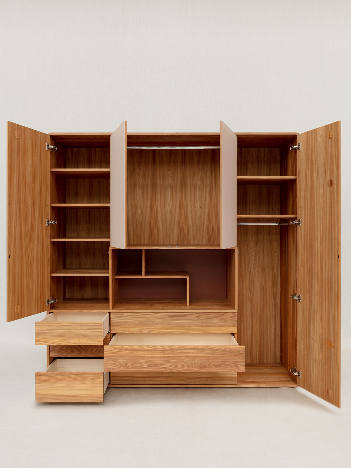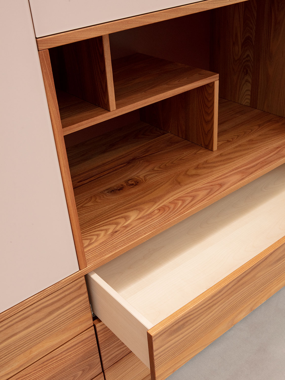 Massivholzschrank mit offenem FachFür einmal ein Schrank, der sich nicht wie eine Wand vor einem Aufbaut. Die Nische in der Mitte bricht die Fläche fürs Auge und ist eine praktische Ablage.