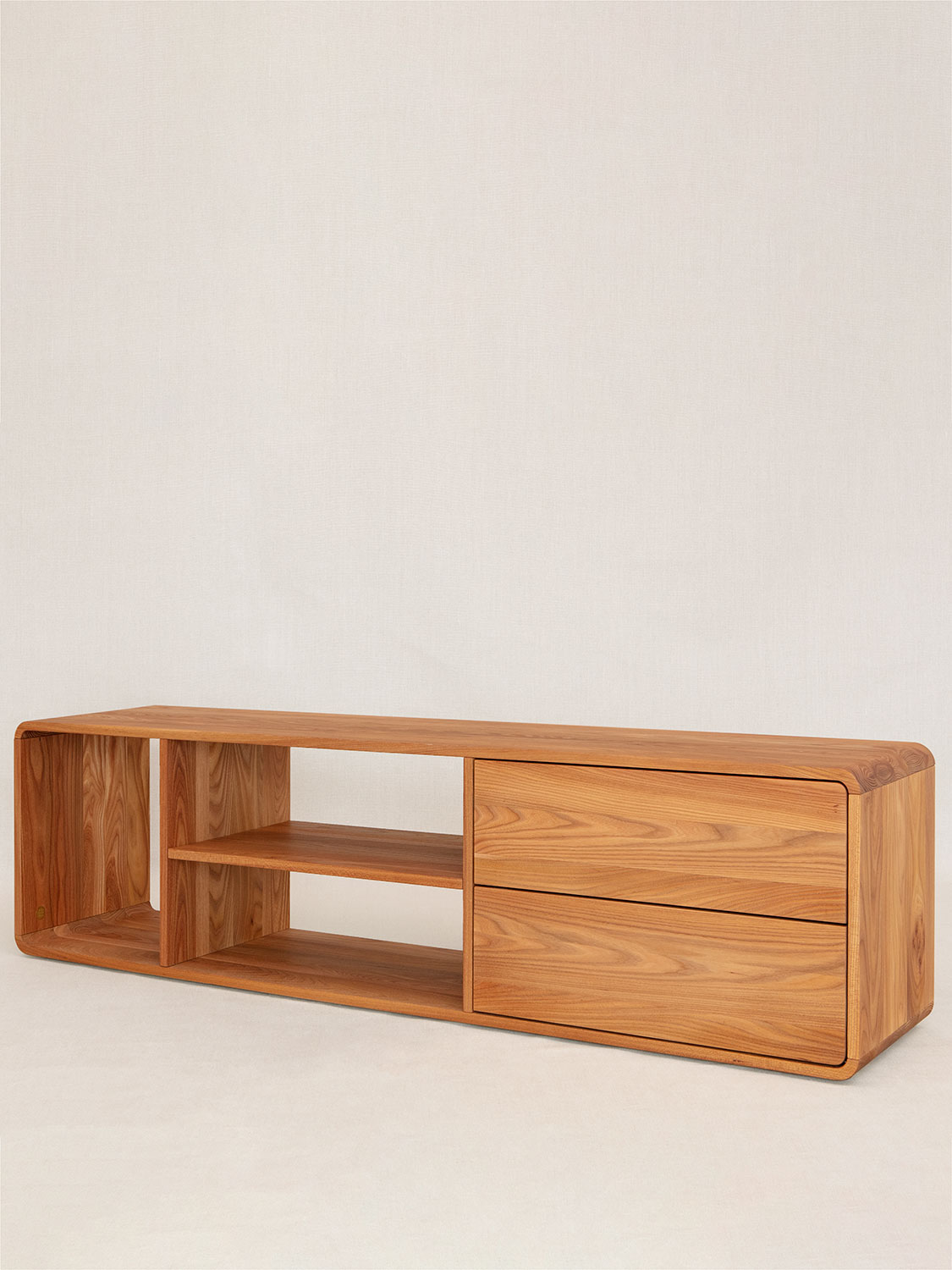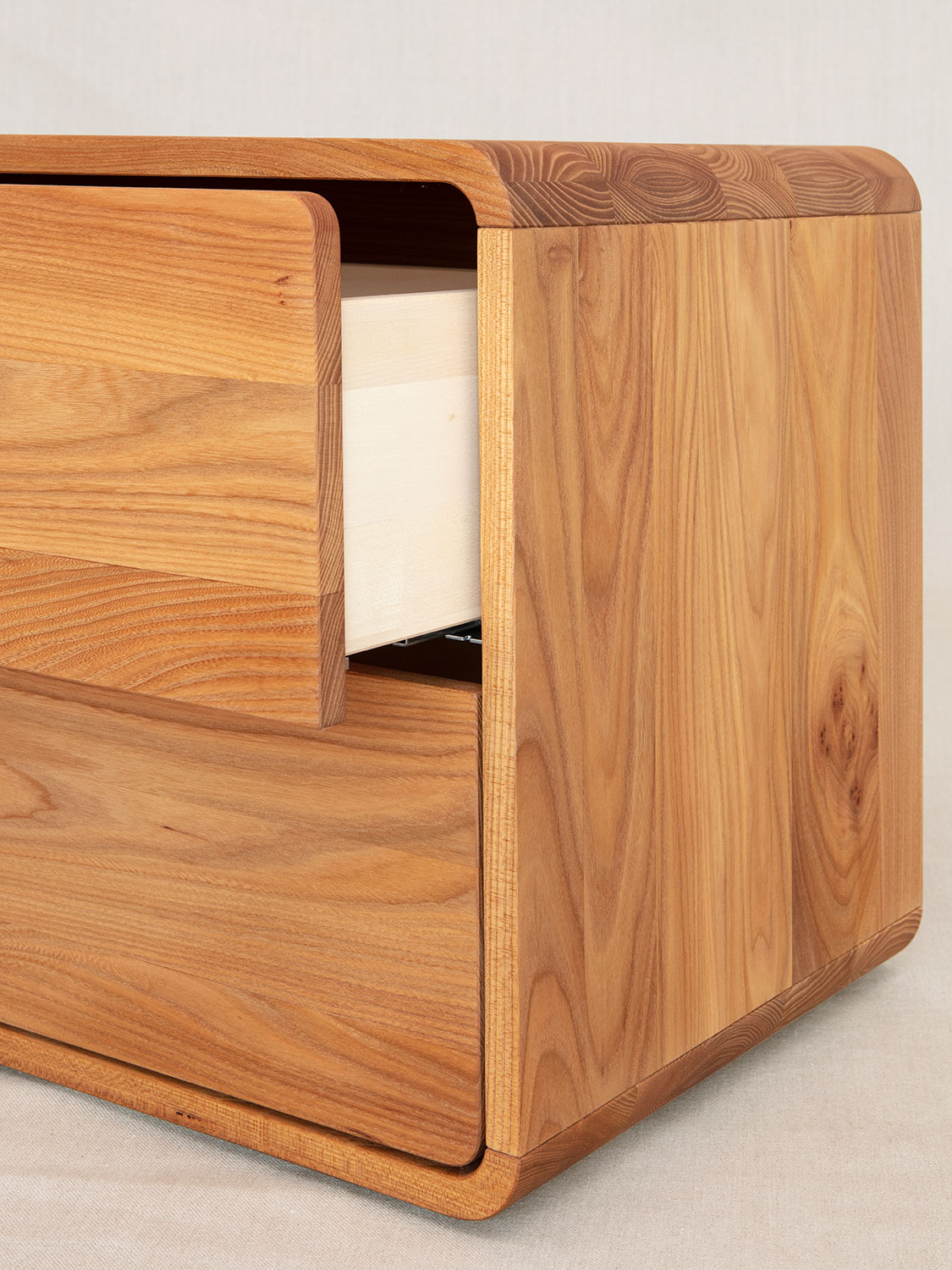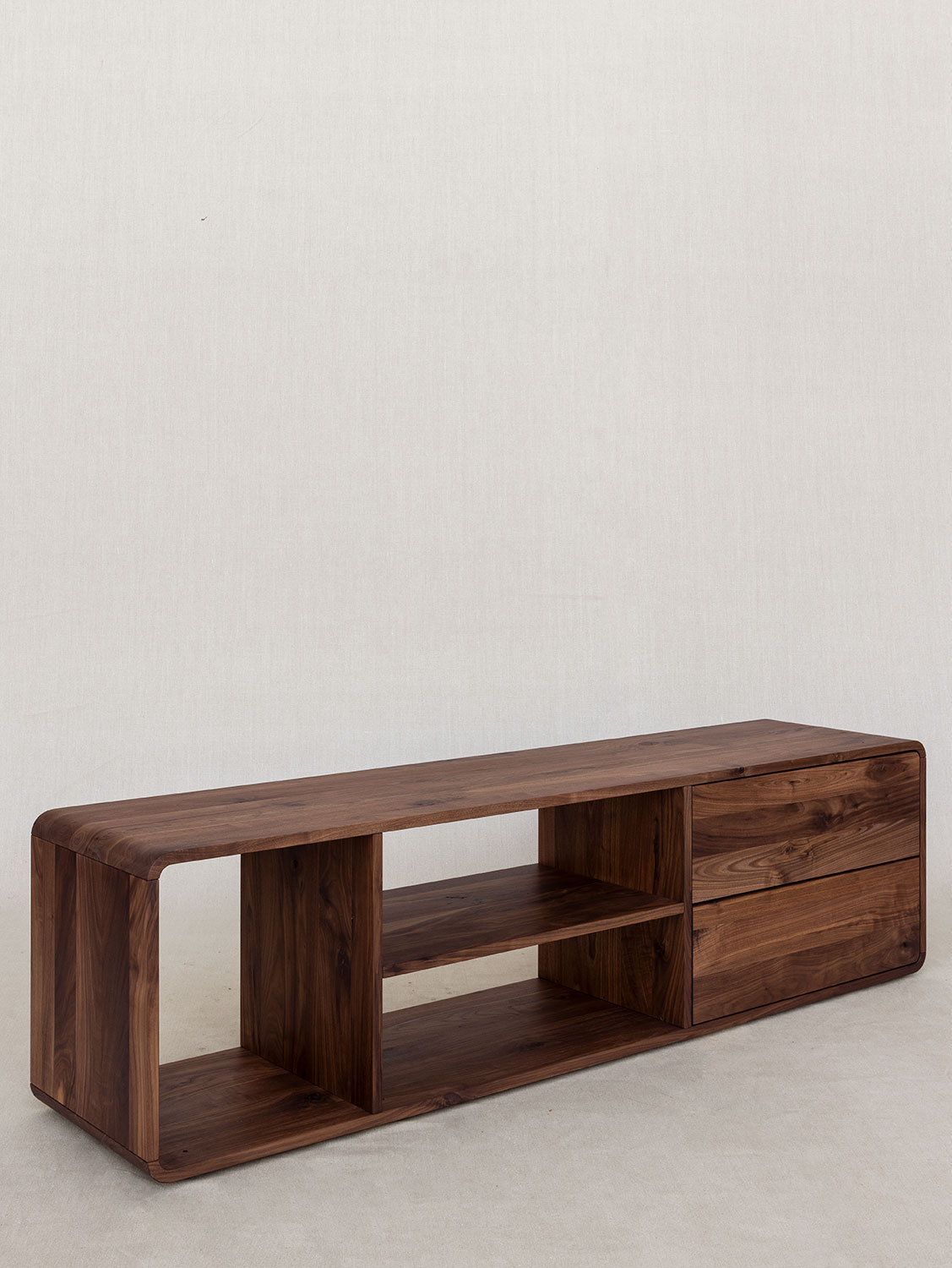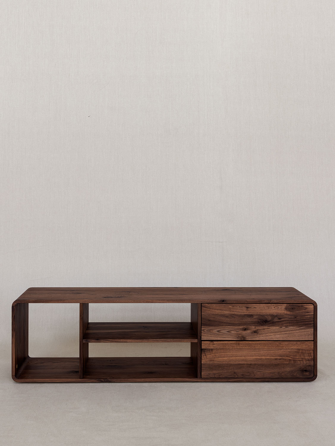 Lowboard aus MassivholzLowboard aus Massivholz mit gerundeten Ecken und zwei Schubladen. Schlicht, funktional, trotzdem dekorativ.
