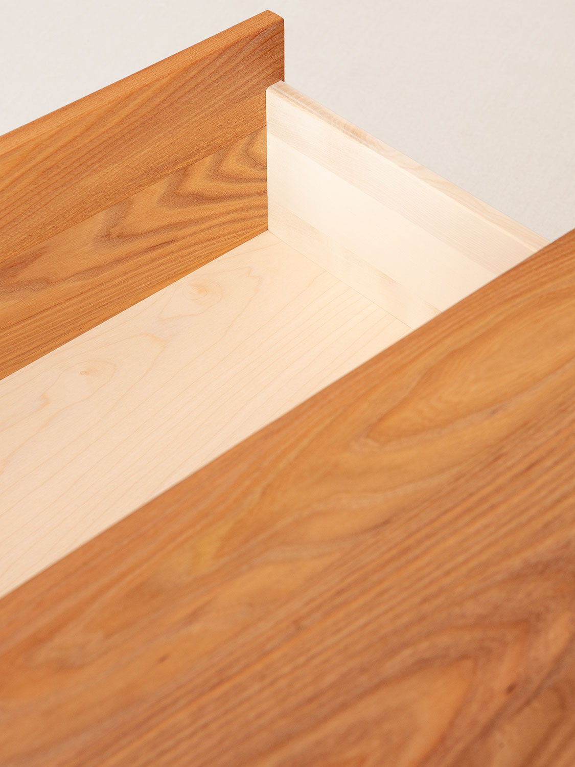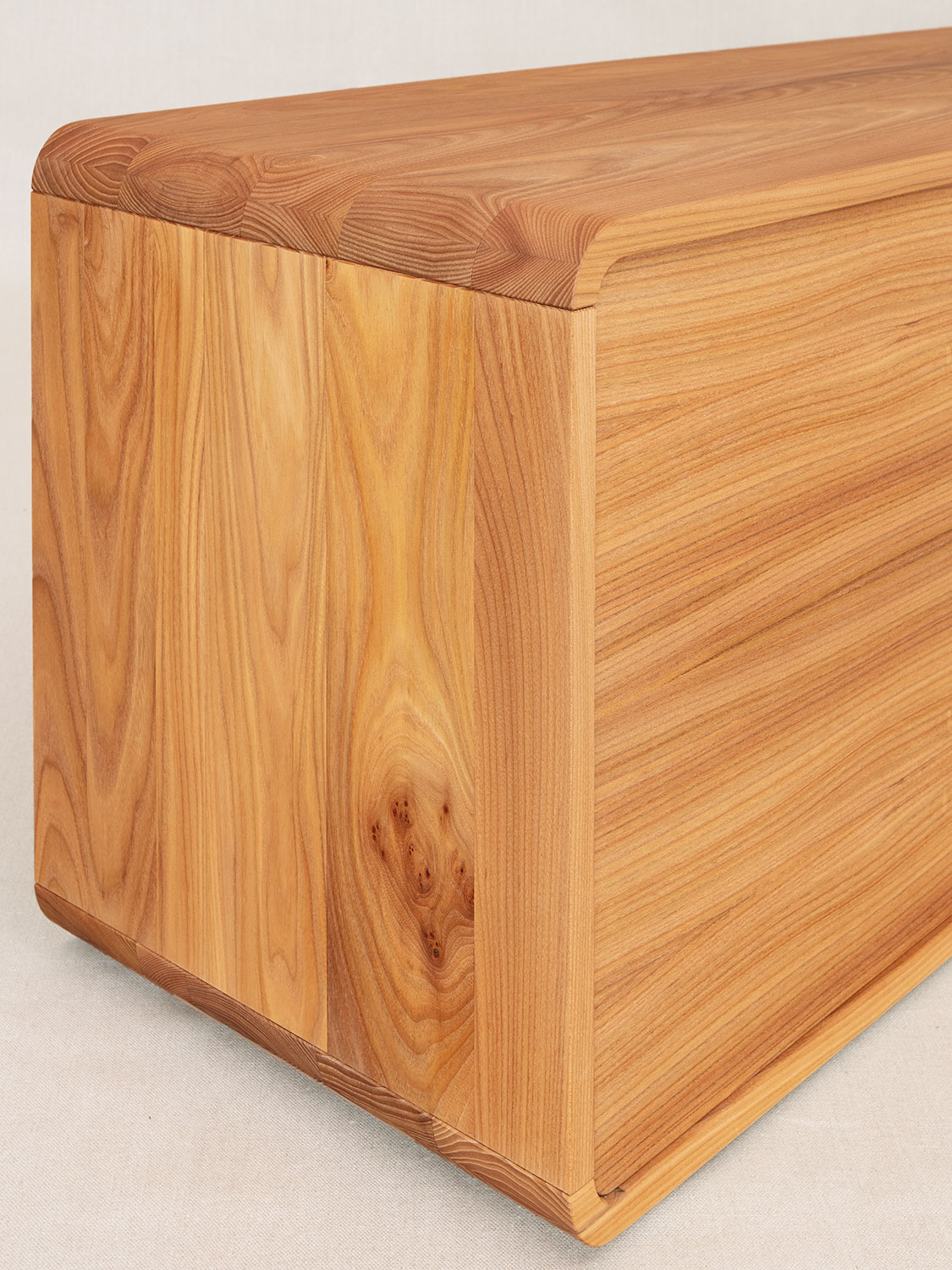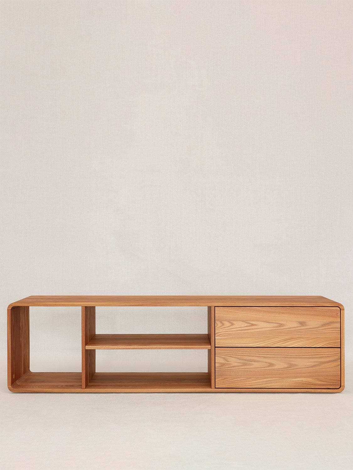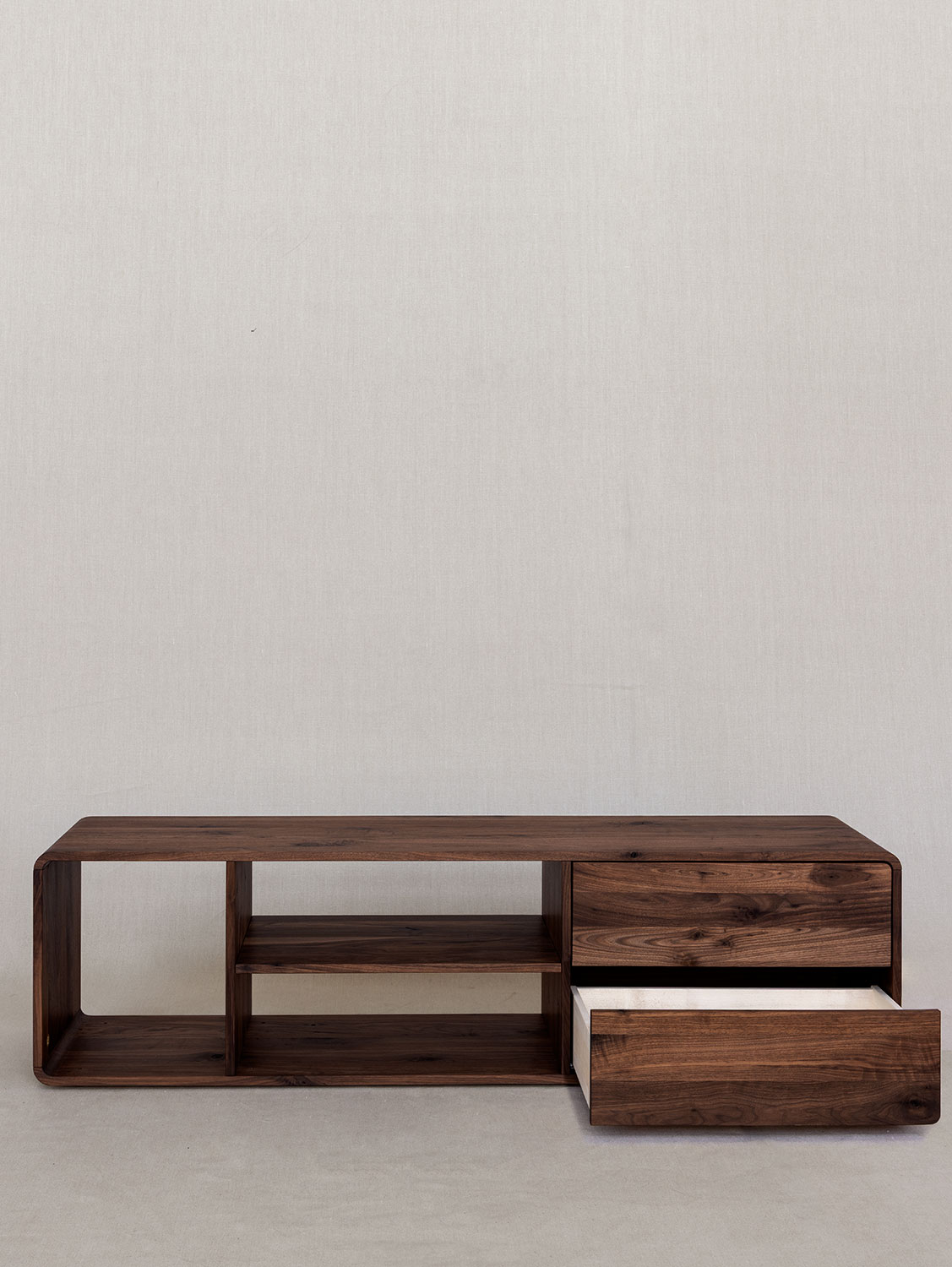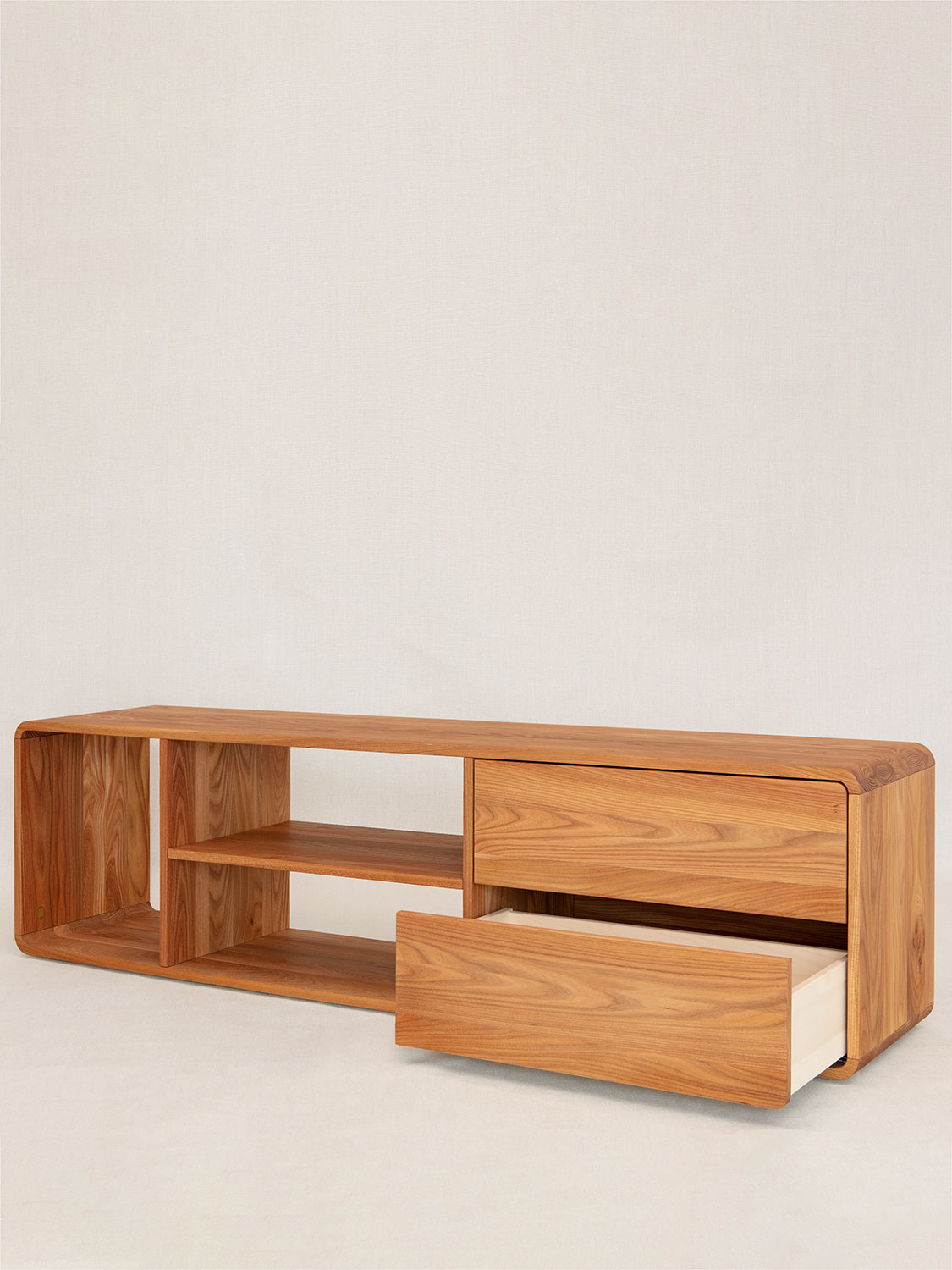 Lowboard aus MassivholzLowboard aus Massivholz mit gerundeten Ecken und zwei Schubladen. Schlicht, funktional, trotzdem dekorativ.